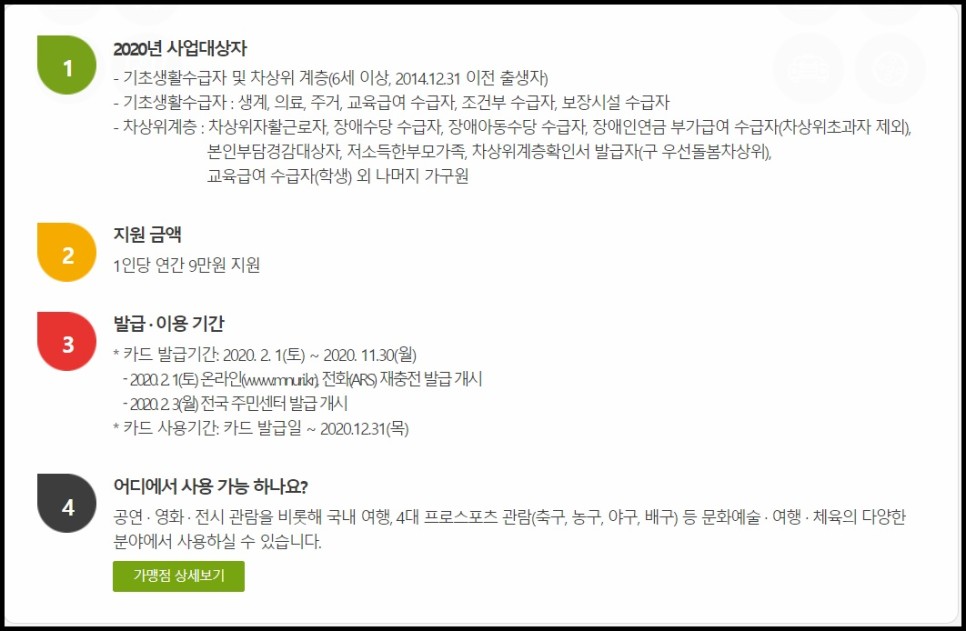 2020년도에는 1인당 연간 9만원이 지급되고 있습니다 문화격차완화를 위해서 기초생활수급자, 차상위계층을 대상으로 지원하고 있죠