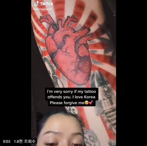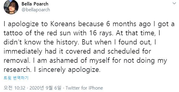 그리고 벨라 포치는 이후에 한국 사람들에게 사과를 한다며 이런 의미를 가지고 있는지 몰랐다고 말했습니다. 또한 문신을 가리든 지우든 할 것이고 내가 이런 역사적인 것에 대해 알지도 않고 문신을 한 것이 너무 부끄럽다며 진심어린 사과를 했습니다.