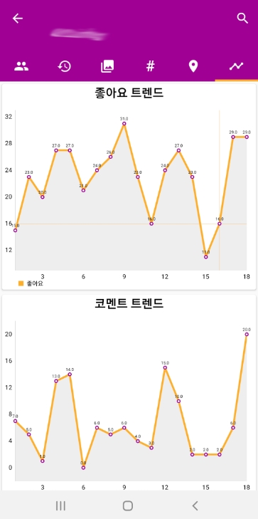 또한 내인스타그램의 방문자들이 내가 달아놓은 해시태그중 어떤 해시태그로 들어왔는지 통계를 볼수있고 좋아요와 코멘트 트렌드까지 확인할수있습니다.