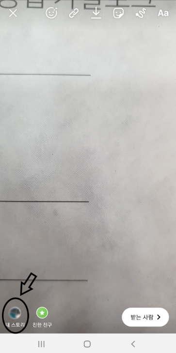 사진을 올린후 인스타그램 홈화면에서 위 상단의 내 스토리를 눌러보시면 방금 찍은 사진이 보이게 됩니다.