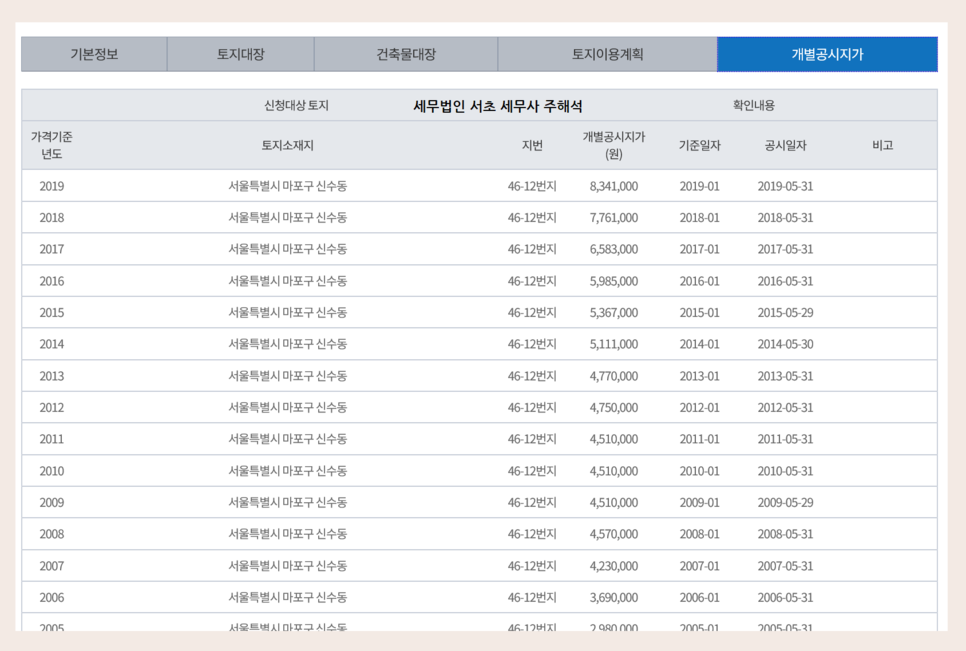 그래서 해당 토지의 공시지가 변동사항을 한눈에 파악할 수 있죠.