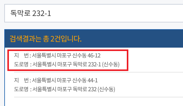 그러면 조회된 목록이 뜨는데 여기서 조회하고 싶은 주소를 선택하시면 됩니다.