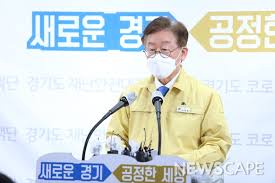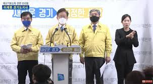 이재명 경기도지사는 24일 경기도청에서 기자회견을 열고 “코로나19로 맞게 된 역사적 위기 국면에서 위기를 기회로 만들며 새로운 시대를 준비해야 한다”며 경기도형 재난기본소득 지급 계획을 밝혔다. 이 자리에는 송한준 경기도의회 의장과 염종현 경기도의회 더불어민주당 대표의원이 함께 했다.