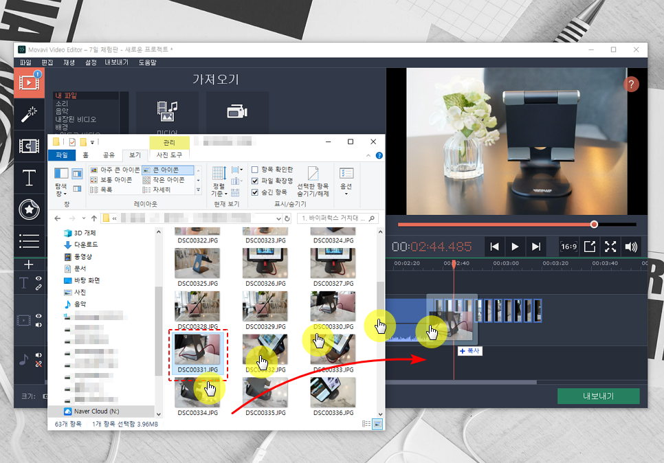 미디어 파일 추가하기를 통하여 소스가 되는 자료를 가져와 타임라인에 끌어다 넣고 원하는 형태로 꾸밀 수 있습니다.