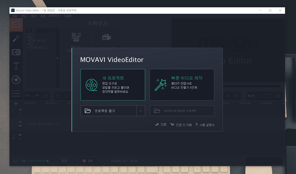 처음 실행을 하면 가장 먼저 두 가지 옵션 중에서 선택하는 화면이 나타납니다. '새 프로젝트'는 모든 과정을 사용자가 하나하나 직접 조작하여 만드는 것이고, '빠른 비디오 제작'은 몽타주 마법사를 통해 초보자라도 이미 갖춰진 틀안에서 최소한의 수정만으로 결과물을 만들어 낼 수 있는 방법입니다.