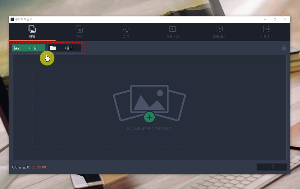 먼저, 파일이나 폴더 버튼을 눌러 사진 등 소스를 가져올 수 있으며, 드래그 & 드롭을 통해 간단하게 넣을 수도 있습니다.