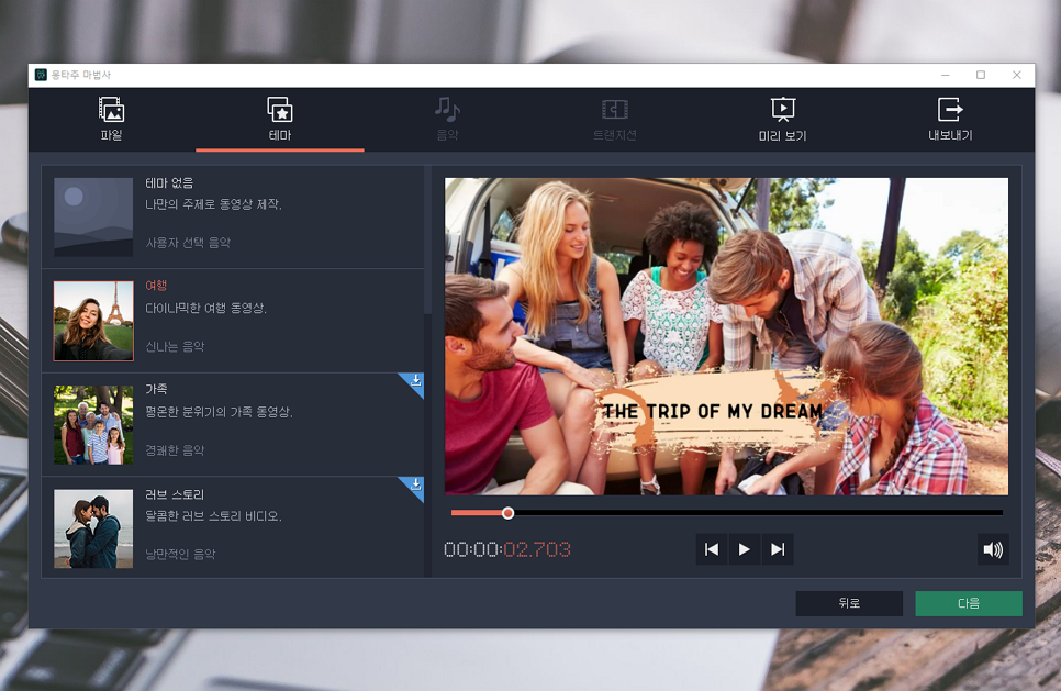 몽타주 마법사부터 살펴볼까요? 5단계만 거치면 너무나 쉽게 한편의 비디오를 만들 수 있습니다.