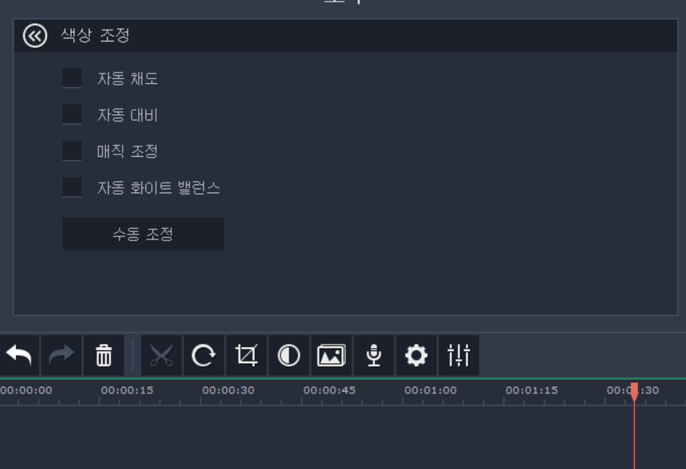 복구, 자르기, 색상 조정, 트랜지션 마법사, 오디오 녹음 설정, 클립 속성, 오디오 속성 등을 다룰 수 있습니다. 보통 클립 속성에서 속도와 빠르기, 페이드인/아웃을 설정합니다. 오디오 속성에는 배경음을 컨트롤하고요. 색상 조정에서는 자동 화이트 밸런스, 매직 조정, 자동 채도/대비 등이 있습니다. 색상 조정은 보통 카메라에서 세팅을 맞춰놓고 하기 때문에 만지지 않는 편입니다.
