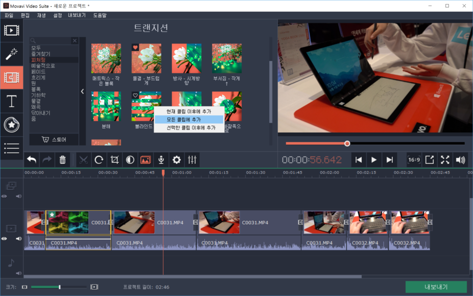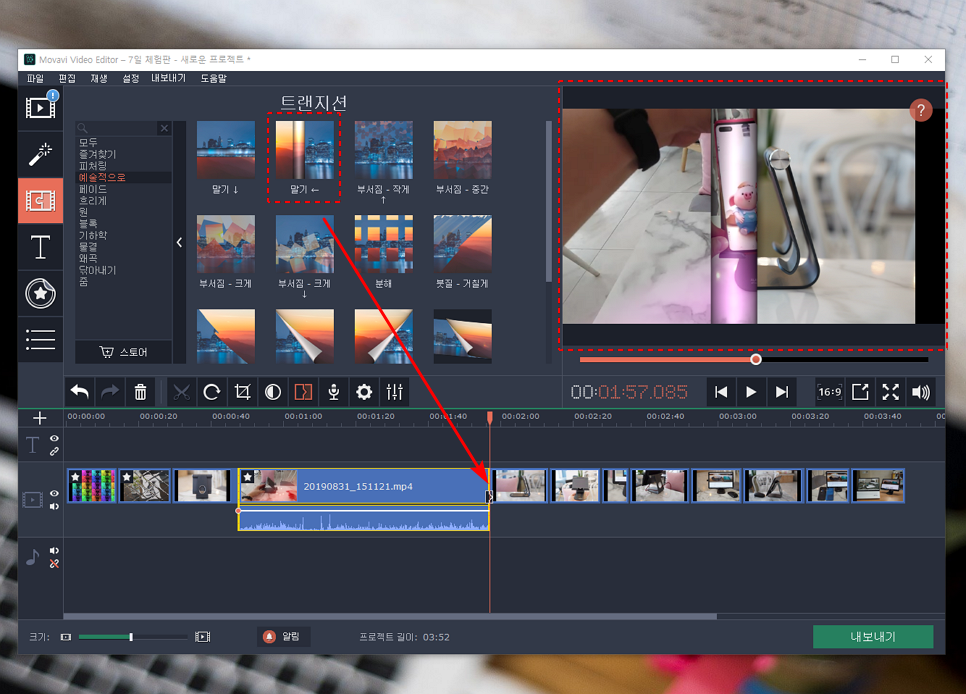 먼저, 원하는 형태를 선정하였다면 각각의 클립 사이에 넣으시고, 미리 보기로 어떻게 변경되는지 확인할 수 있습니다.