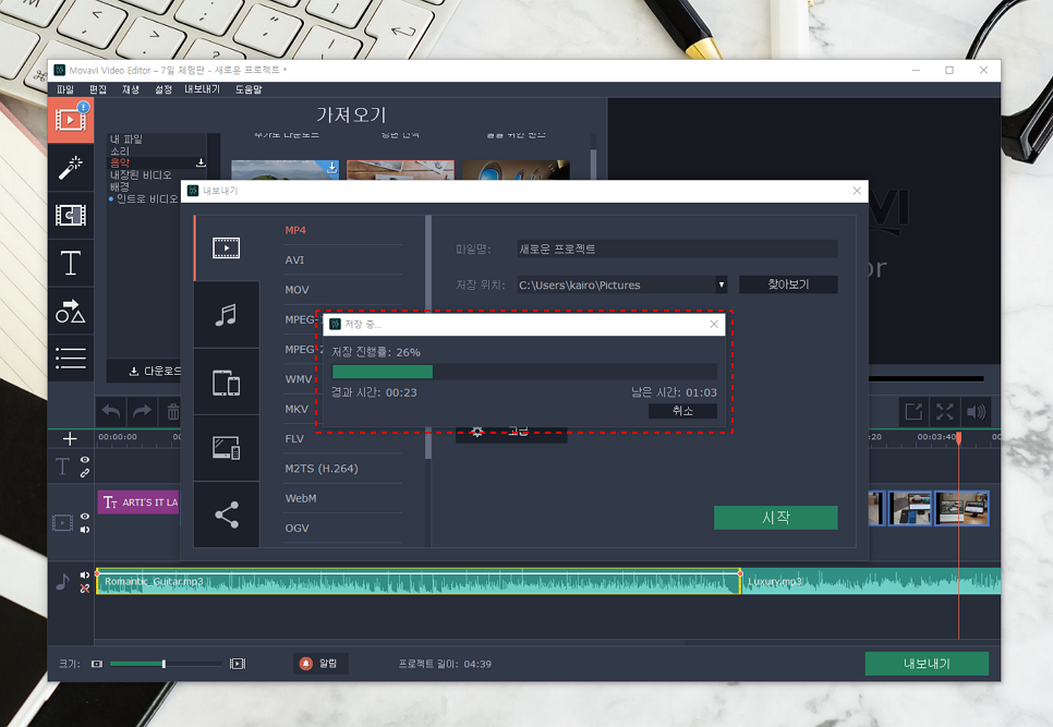 마지막으로 하나의 비디오 파일로 내보내기 하면 모든 과정을 마칠 수 있는데요, 화면 하단에 있는 '내보내기'를 눌러 저장 형식과 위치를 지정한 후 최종 결과물을 만들어 낼 수 있습니다.