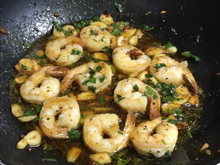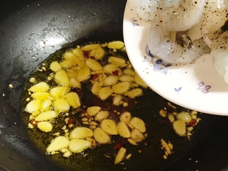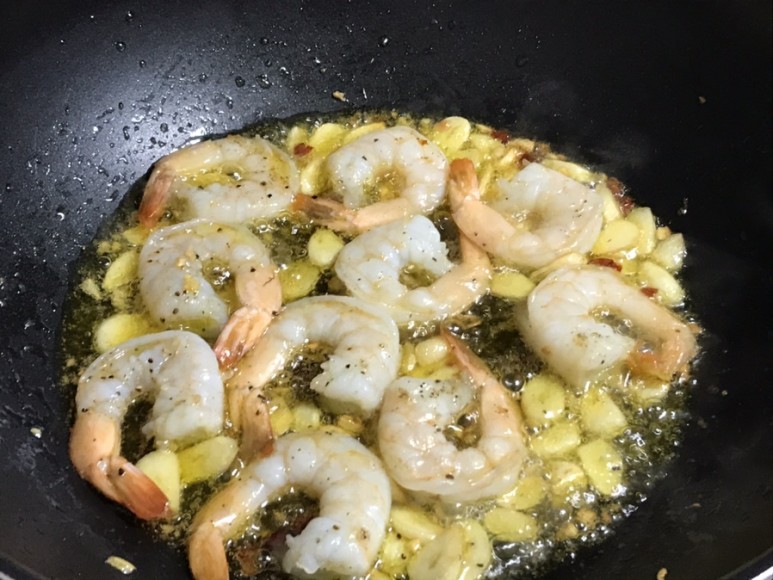 마늘이 황금빛을 띠면 밑간한 새우를 넣어준다. 새우의 양 면이 고루 익도록 자주 뒤집어 준다. 옅은 선홍색을 띨 때까지 반복해요. 새우가 오버쿡되지 않도록 주의해 주세요. 오버쿡된 새우는 식감이 푸석하고 질겨지니 탱글한 새우의 식감을 위해 옅은 선홍색이 되도록 조리해요.