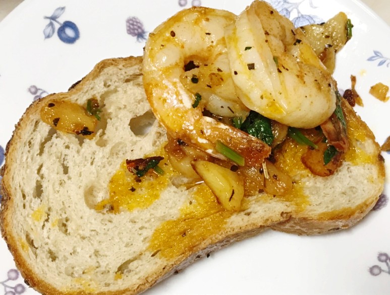 새우 / 올리브오일 / 마늘 / 페페론치노 / 호밀빵 / 훈제파프리카파우더 / 레몬즙 / 이태리파슬리 / 바질가루 / 소금 / 후추 / 후라이팬