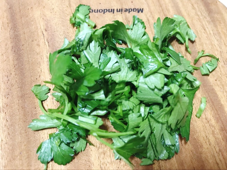 남은 마늘을 편썰기하고 페페론치노는 반 씩 쪼개서 준비. 이태리 파슬리는 잎 부분을 손으로 뜯은 후 잘게 다진다. 페페론치노를 잘게 부술 수록 매운맛이 강해집니다. 기호에 맞게 매운맛을 조절해 주세요. 파슬리는 잎을 뜯은 후 손으로 뭉쳐서 자르면 다지기 쉽습니다.