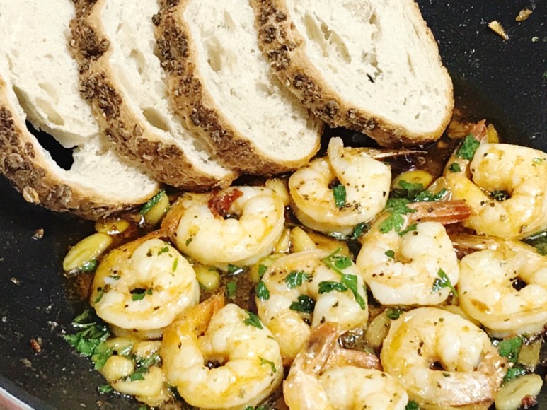 맛있게 익어간 감바스 알 아히요 새우요리에 호밀빵을 팬에 기름없이 굽거나 오븐에 구워 함께 곁들여 먹으면 정말 한끼 식사로 베리굿! 빵위에 새우를 올려 드시거나 올리브 오일에 찍어서 드세요!
