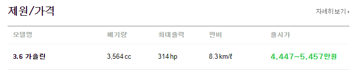 파워트레인은 V6 3.6L 가솔린 직분사 엔진과 9단 자동변속기를 결합해 최대 314마력, 최대 36.8kg의 힘을 발휘한다. 이 엔진은 너무 많이 또는 너무 많이 사용하지 않고 오랫동안 안정적으로 사용할 수 있도록 설계되었다. 9단 자동변속기는 필요한 송전선로만 구성되어 있어 사전에 D 모드와 L 모드만 있을 뿐 조작에는 문제가 없다.