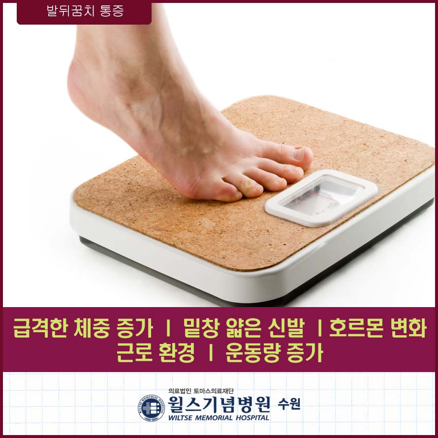 족저 근막염의 원인은 매우 다양하기 때문에 특정적으로 몇 가지를 꼽긴 어렵습니다. 근로 환경, 개인적 습관 등에 의해 발생하는 경우도 많고 갑작스러운 체중 증가도 발뒤꿈치 통증의 원인이 될 수 있습니다. 특히 체중은 발에 가해지는 충격과 무게에 직접적으로 영향을 미치기 때문에 종아리 근육이나 아킬레스건 통증도 무시할 수 없지요. 아마 위의 사례인도 임신을 하면서 급작스럽게 몸무게가 커지고 그로 인해 발통증이 생겼을 확률이 높습니다.