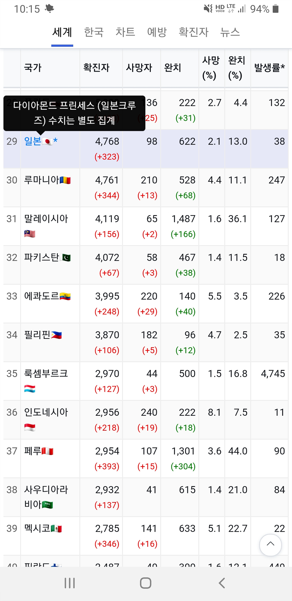 초기 다이아몬드 프린세스호에서의 발병도 일본 확진자로 넣지 않고 그리고 유럽과 북미에 비해 중국과 물리적으로도 그리고 인적 교류도 많았으며 또한 인구 밀집도가 상당한 도시들이 많은 일본에서 코로나 확산이 적어도 통계적으로는 많지 않았었어요