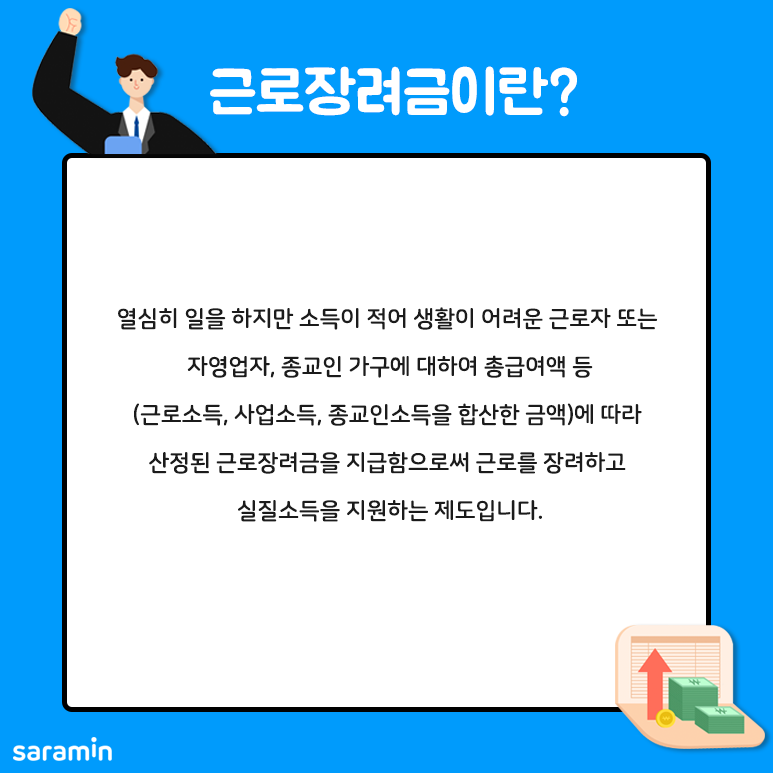 열심히 일을 하지만 소득이 적어 생활이 어려운 근로자 또는 자영업자, 종교인 가구에 대하여 총급여액 등 (근로소득, 사업소득, 종교인소득을 합산한 금액)에 따라 산정된 근로장려금을 지급함으로써 근로를 장려하고 실질소득을 지원하는 제도입니다.