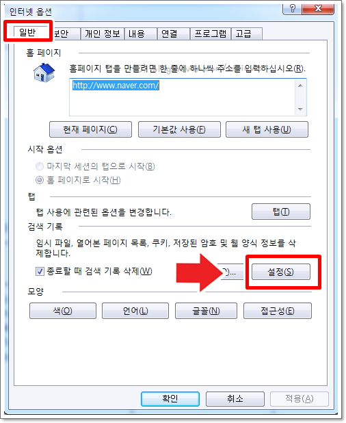 검색기록 - 임시 파일, 열어본페이지 목록, 쿠키... 삭제의 설정 버튼을 클릭합니다.