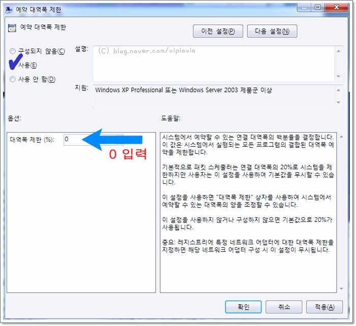 사용에 체크하신후 대역폭제한 입력란에 기본값으로 입력된 20% 값을 >> 0으로 바꿔 입력한후 적용 버튼을 클릭하여