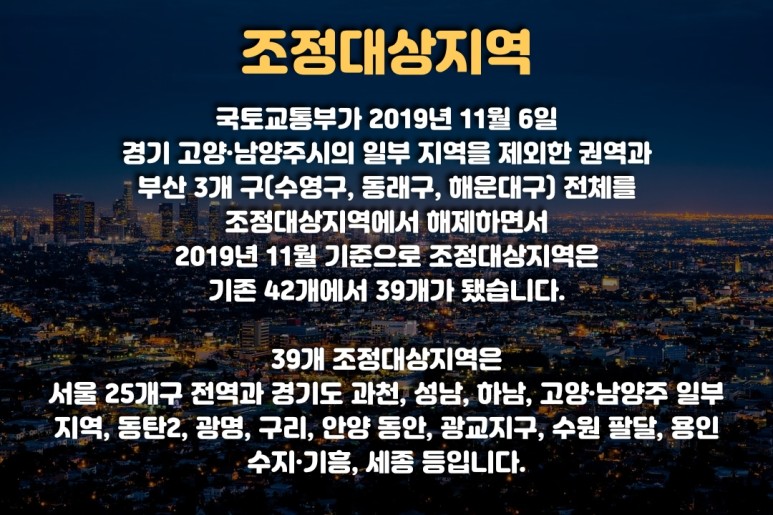 새로운 규제가 적용되는 중심에는 이번에도 조정대상지역이 있었습니다. 서울 모든 지역과 세종, 경기(과천, 성남, 하남, 광명, 구리, 등) 등 39곳으로 지정되어 있습니다.